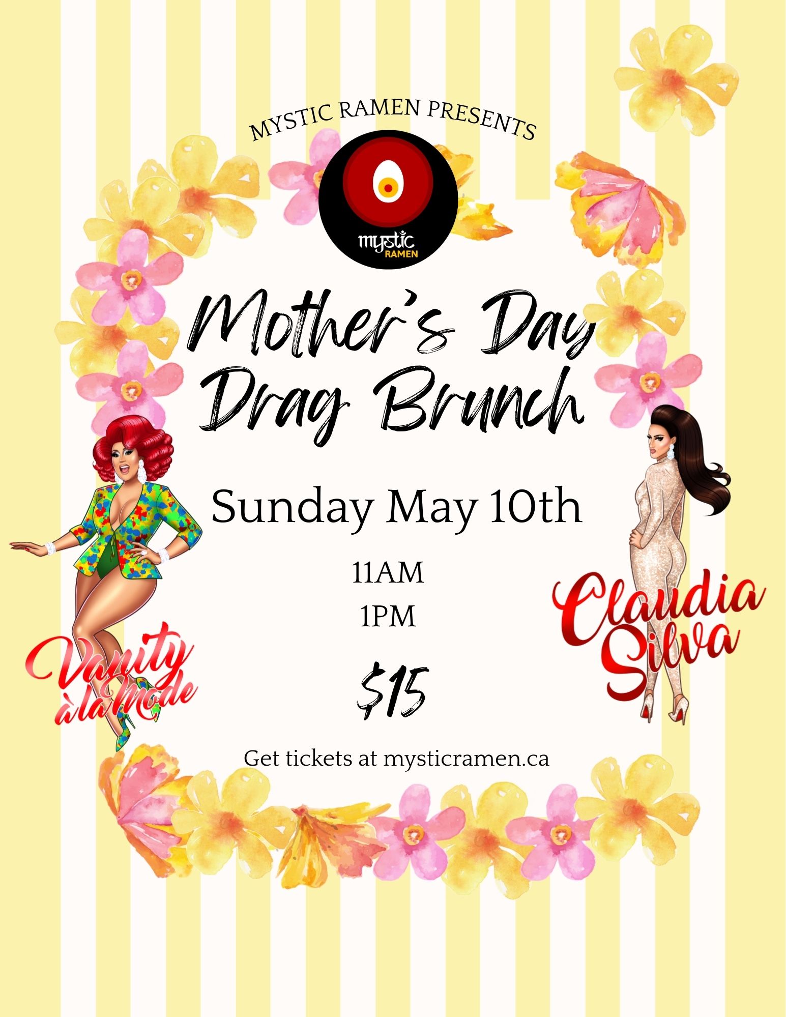 Join us for our 4th annual Mother’s Day Drag Brunch at 1pm! Our favourite queens, Vanity a la Mode and Empress Claudia Silva are back and serving up looks and laughs for your entertainment. We’re serving up all your favourites from the kitchen and the bar. Come join us, but don’t delay! This event is a sellout every year!